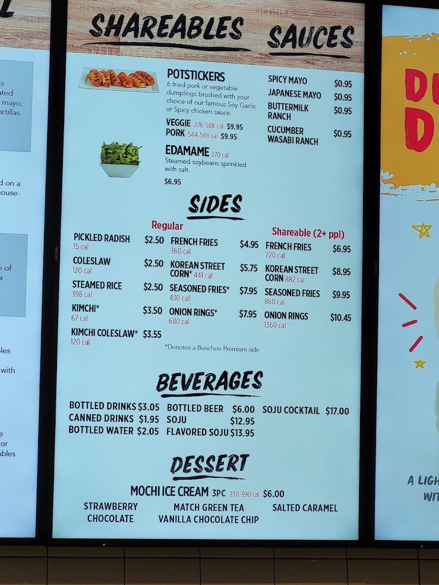 All your favs! 2 drums, 4 wings, Bulgogi Fries, Pork Potstickers, Korean Street Corn and Coleslaw. Your choice of Bonchon signature sauce and a dipping sauce. Feeds 2-3