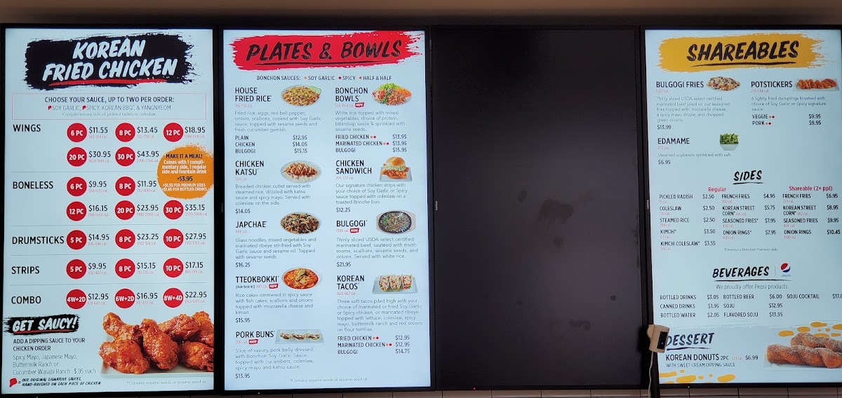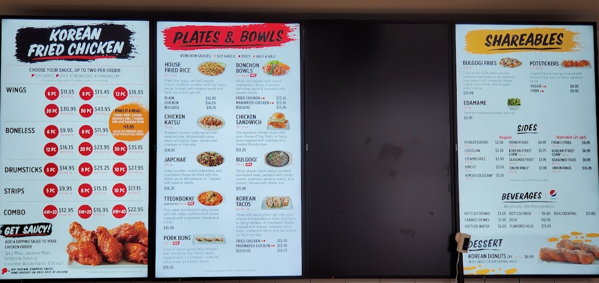 The menu at Bonchon Brentwood offers a satisfying blend of Korean-inspired dishes and classic comfort options, appealing to both casual diners and groups. Their Dine In Daily Special, the Wing Deal For 2, sets the tone with crispy, flavorful wings, while Lunch Specials like the Mixed 6 PC: 4 Wings + 2 Drums, Wings 6 PC, Boneless 8 PC, Drums 3 PC, and Strips 5 PC provide convenient, hearty portions at accessible prices. For those seeking signature bites, the Featured Items such as Sotteok Sotteok, Dumpling Soup, Omurice, MoPo Corndog, and the Seoul Sampler highlight the restaurant’s creative fusion of flavors. The Korean Fried Chicken section lets diners choose from Drums, Strips, Wings Mixed, and Boneless, ensuring there’s something for every preference. Small plates like Bulgogi Fries, Bao Buns, Edamame, and Sotteok Sotteok under Bonchon Bites offer shareable options, while traditional Korean Dishes such as Dumpling Soup, Omurice, Chicken Sandwich, Fried Rice, and Bibimbap provide heartier meals. Complementing the main dishes, sides like Kimchi, Pickled Radish, Steamed Rice, Coleslaw, and various Dipping Sauces add authentic touches. Sweet cravings are met with 1pc Korean Donut & Sauce or 2pc Korean Donuts & Sauce, and larger gatherings are easily accommodated with K-Meals To-Go for 4-6, 6-8, or 8-10 people, along with Party Bundles featuring Wings, Strips, Fried Rice, Fries, and Korean Street Corn. A selection of drinks, including Pepsi Bottle, Diet Pepsi Bottle, Mountain Dew Bottle, Starry Bottle, and Bottled Water, rounds out the menu. Overall, Bonchon Brentwood presents a versatile menu where bold Korean flavors meet approachable favorites, making it a dependable choice for both individual meals and group gatherings.
